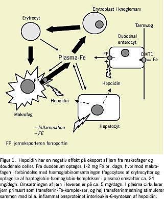 Hepcidins virkning på makrofagen har umiddelbart den kvantitativt største effekt på plasmajernkoncentrationen, da makrofagen spiller en central rolle i hæmoglobinomsætningen (Figur 1 ). Hepcidins virkninger forklarer nu de tidligere tilsyneladende paradokser, at patienter med anæmi ved kronisk inflammation har lavt serumjern, men rigeligt jern i makrofager i knoglemarven, og at de fleste patienter med hæmokromatose trods ophobning af jern i hepatocytterne har et lavt indhold af jern i makrofagerne. De fleste patienter med hæmokromatose har tilsyneladende nedsat hepcidinproduktion, hvilket sandsynligvis leder til ureguleret jernudskillelse fra enterocytter og makrofager til plasma (Figur 1) med sekundær ophobning i lever og andre organer til følge.