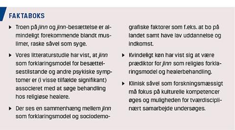 besættelse hos muslimer og deres behandlingssøgende adfærd var ikke entydige i deres resultater. Majoriteten (n = 11) af studierne viste en markant øget tendens til at anvende jinn som primær forklaringsmodel for psykiske symptomer/sygdomme hos muslimer. Denne forklaringsmodel var associeret med at søge behandling hos traditionelle healere.