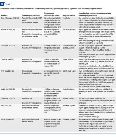 Studierne var udført med populationer bestående af muslimske psykiatriske patienter [1, 10, 14-17], muslimske (tilfældige) raske personer [18-20], herunder lærere/studerende [21] og mødre [22]. I et enkelt studie [23] dominerede den biomedicinske forklaringsmodel og medicinsk behandling i forhold til den religiøse forklaring, mens man i et andet [24] fandt manglende sammenhæng mellem religiøs forklaringsmodel og brug af healere. I de sidste tre studier, der var udført med raske immigranter [25, 26] og psykiatriske patienter [27], pegede resultaterne på samtidig brug af religiøs og biomedicinsk forklaringsmodel, hvor traditionel behandling var det foretrukne valg i to af tilfældene [25, 26], og kun i et enkelt [27] blev begge instanser brugt lige meget.