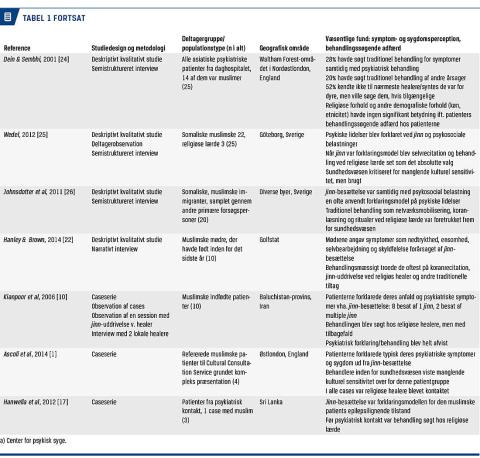For at forsøge at svare på om og i hvilket omfang jinn som forklaringsmodel har indflydelse på behandling i psykiatrisk regi, gennemførte vi en litteratursøgning i PubMed med søgeordet jinn. Af de 96 hit vi fandt, ekskluderede vi artikler, som ikke var engelsksprogede, og hvor healere var den undersøgte population. Kun artikler, hvor man undersøgte jinn som forklaringsmodel for psykiske symptomer hos muslimer og deres behandlingssøgende adfærd, blev inkluderet. Vi fandt 16 relevante artikler (to prospektive kohortestudier, fem tværsnitsstudier, seks deskriptive kvalitative studier og tre kasuistikker). De undersøgte populationer i studierne varierede i både type og geografisk lokalisation, f.eks. indgik både raske personer og psykiatriske patienter. Forskningen er overvejende foregået i asiatiske og europæiske lande.