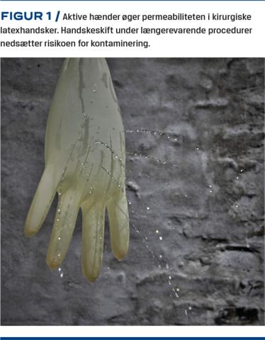 Da dette var en førstegangsaffære for mellemvagten, forudså han ikke, at de tre lag handsker potentielt kunne fejle i at bringe ham sikkert igennem proceduren. Handskernes integritet afhænger bl.a. af handskematerialet, procedurens varighed og typen af procedure eller operation [1]. Latex, nitril og vinyl er gængse handskematerialer. De består af forskellige typer af polymerer (makromolekyler bundet sammen i lange kæder) [5]. Af de tre typer materiale har polymerstrukturen i latex vist sig at blive mindst påvirket ved håndbevægelser [5]. Studier har vist en positiv korrelation mellem varigheden af handskebrug og perforationsraten (Figur 1), og derfor øges den kemiske permeabilitet for flygtige gasser ved langvarigt aktivt handskebrug [1, 5]. I et litteraturstudie foreslår man, at handskeskift bør ske efter < 60-120 min afhængigt af specialet, for at bevare den barrierebeskyttende effekt [1] og dermed også mindske risikoen for transport af mikroorganismer mellem kirurg og patient. I studiet adresseredes termen surgical site infection (SSI) som er en hyppig komplikation for patienter under operationer, og at øget handskepermeabilitet kunne fordoble risikoen for SSI [1].