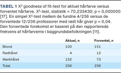 Ved en sammenligning af de fundne frekvenser af hårfarver blandt de inkluderede professorer med tallene for baggrundsbefolkningen (5% rødt hår, 31% brunt hår og 64% blondt hår [11]) fandtes en p-værdi på 0,000000 (se Tabel 1). En simpel X2-test mellem de fundne 4/236 versus de forventede 12/236 professorer med rødt hår giver en p-værdi på 0,04. Det vil sige, der var signifikant forskel på fordelingen af hårfarverne mellem de to populationer, og de faktuelle tal for rødhårede på 1,7% versus de forventede 5% viste således, at andelen af rødhårede var underrepræsenteret i gruppen af professorer på Institut for Klinisk Medicin på Københavns Universitet.