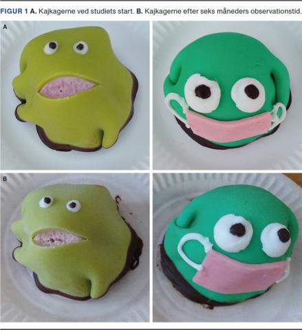 For at sikre en ensartet studiepopulation med 100% korrekt anvendelse af mundbind dækkende både mund og næse samt ingen ansigtsberøringer blev den velkendte kajkage valgt som studiepopulation. Kajkager har ingen arme og ben og dermed ingen mulighed for at displacere mundbindet eller berøre ansigtet i observationsperioden. Herudover er indholdet i kajkager meget ensartet og består næsten 100% af sukker. Studiepopulationen bestod af to tilfældigt udvalgte kajkager, der var produceret på danske bagerier efter en standardiseret opskrift. Én kajkage indgik i interventionsgruppen og én kajkage indgik i kontrolgruppen, dvs. n = 2. Forsøgsdeltagerne blev matchet på vægt samt en glat og pæn overflade uden defekter. Forsøgsdeltageren i interventionsgruppen fik et mundbind placeret korrekt over næse og mund. Kontroldeltageren bar intet mundbind i observationsperioden på seks måneder. Forsøgsdeltagerne blev undersøgt med vægt, mål og inspektion af overfladen én gang om måneden. Efter seks måneder blev kagerne delt på midten for at inspicere indholdet. Vægt samt udseende af overflade og indhold blev brugt som surrogatmål for smitte med mikroorganismer, idet det må antages, at en inficeret kajkage vil tabe sig i vægt og/eller ændre overflade/indhold. Der blev anvendt et standardmålebånd med centimeterangivelse og en elektronisk vægt, som kan måle ændringer på 5 g. Forsøgsdeltagerne blev placeret på et gennemsnitligt dansk sygehus (ca. midt i landet) i observationsperioden for at sikre relevant udsættelse for mikroorganismer. Observationsperioden strakte sig fra den 1. marts 2021 til den 31. august 2021, og forsøgsdeltagerne blev således udsat for store temperatursvingninger.