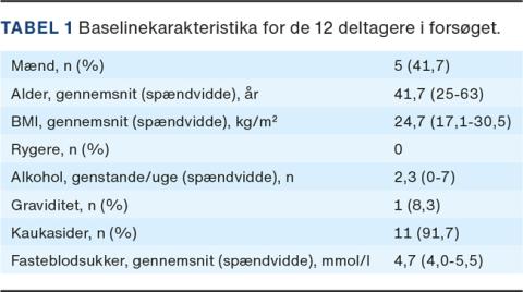 Vi screenede 14 deltagere hvoraf én måtte udgå pga. type 1-diabetes og en anden pga. graviditetsdiabetes. Vi inkluderede således 12 deltagere i alt. Baselinekarakteristika kan ses i Tabel 1. Forsøgsdeltagerne var yngre, overvejende kvinder med et gennemsnitligt normalt BMI og med et utroligt lille alkoholforbrug i forhold til den danske befolkning. Kun én person var ikke kaukasid, men asiat fra det før ukendte, men efter COVID-19 verdenskendte Wuhan.