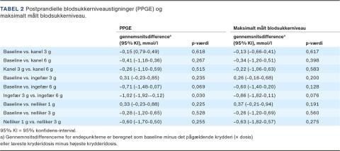 Der var ingen forskel i PPGE mellem baseline og risengrød med de forskellige krydderier uanset dosis (Tabel 2). Vi fandt en overraskende forskel i PPGE mellem 3 g ingefær og 6 g ingefær, med størst stigning i PPGE på 6 g ingefær (p = 0,030). Vi fandt ingen forskel i maksimalt målt blodsukkerniveau mellem krydderierne og baseline eller krydderidoserne imellem.