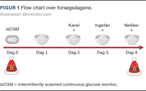 Forsøget forløb således (Figur 1): Dag 0: Påsætning af flashglukosemonitoreringssystemet. Dag 1: Risengrød uden krydderier til morgenmad og frokost. Dag 2: Risengrød til morgenmad og frokost med hhv. 3 og 6 g kanel. Dag 3: Risengrød til morgenmad og frokost med hhv. 3 og 6 g ingefær. Dag 4: Risengrød til morgenmad og frokost med hhv. 1 og 3 g stødt nellike.