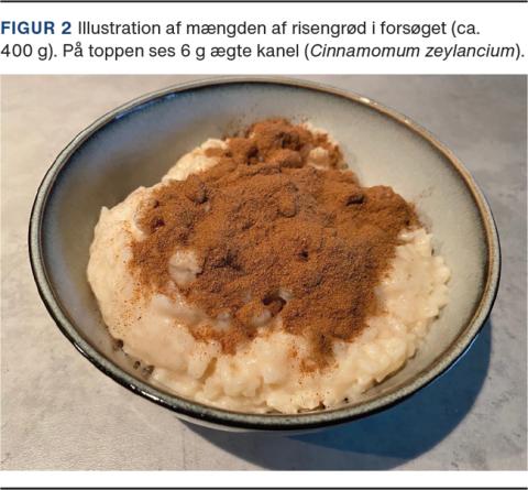 Opskrift på risengrød (Figur 2): Seks portioner svarende til to dages indtag i forsøget: 2 l Arla laktosefri letmælk (2,8 g kulhydrat pr. 100 g), 5 dl vand, 360 g grødris (80 g kulhydrat pr. 100 g), 1-2 tsk. salt. Derudover: Dag 2: kanel, 3 g til morgenmad og 6 g til frokost. Dag 3: ingefær, 3 g til morgenmad og 6 g til frokost. Dag 4: stødt nellike, 1 g til morgenmad og 3 g til frokost. Dette svarer til et indhold på ~ 57 g kulhydrat pr. portion, hvilket vurderes at være et standardindtag, medmindre man er på low carb-kur.