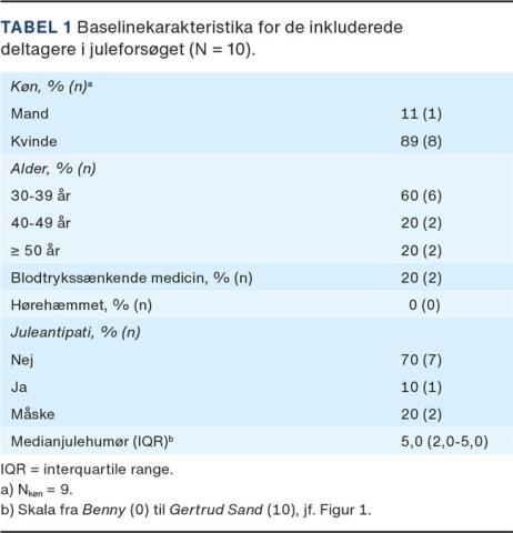 Vi screenede ti deltagere, som alle blev inkluderet (inklusive Grinchen, som heldigvis ikke forstyrrede den gode julestemning). Baselinekarakteristika ses i Tabel 1. Studiepopulationen var i gennemsnit midaldrende (fra ung til gammel og alt midtimellem) [5], identificerede sig helt overvejende som kvinder (bortset fra én, der angav at være mand, og én, der manglede at angive køn). Julehumøret kan beskrives som mest Benny, men med en enkelt Gertrud imellem. Én person havde juleantipati (vi gætter på, at det var Grinchen) (Tabel 1).