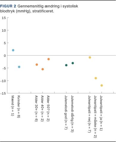 I den stratificerede oversigt (Figur 2) ses, at kvinder har et fald i systolisk blodtryk, mens mænd (n = 1) har en stigning. Deltager med juleantipati har det største fald, og hvorvidt man kunne lide julemelodien elle ej, havde ikke mærkbar påvirkning.
