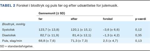 Inden deltagerne blev udsat for julemusikken, blev der målt et gennemsnitlig systolisk blodtryk på 123,7 mmHg (som er ganske gennemsnitligt for den danske befolkning) og en puls på gennemsnitligt 68,8 slag i minuttet. Interventionen påvirkede det systoliske blodtryk med en reduktion på 3,6 mmHg (2,9%), mens pulsen steg med 2,5 slag i minuttet (3,6%) (Tabel 2).