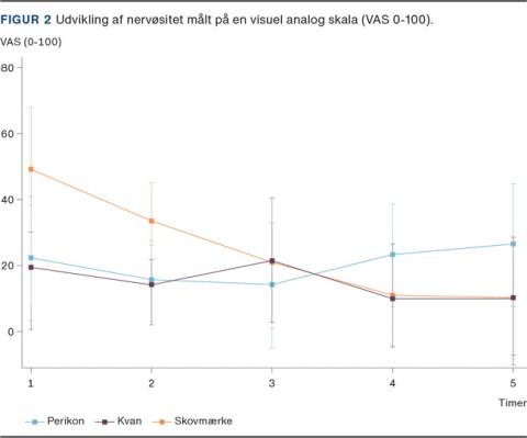 Faldet i nervøsitet (Figur 2) var signifikant for gruppen eksponeret for skovmærke (p = 0,001), og denne udvikling var signifikant forskellig fra de to andre grupper (p = 0,02). Desværre bekræfter dette ikke hypotesen om, at perikon reducerer nervøsitet, hvor en nonsignifikant udvikling fandt sted (p = 0,62). Der var ikke signifikant forskellig udvikling af deltagernes melankoli (p = 0,66) eller afføringskonsistens (p = 0,24) over tid.