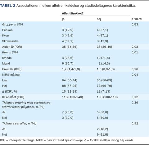 Basisinformation er angivet i Tabel 1 uden fund af større skævvridninger mellem de eksponerede grupper. Én fra hver gruppe droppede ud før tid uden angivelse af årsag, hvilket gav os (nær)komplette data på i alt 18 forsøgspersoner. 10 (48,6%) ud af 21 personer tiltrak på mindst et tidspunkt i løbet af aftenen alfer uden nogen signifikant forskel mellem de tre grupper (Tabel 2). Tiltrækning af alfer var associeret med mandligt køn (p = 0,01), lavere alder (p = 0,03) og stigning i cerebral vævsoxygenering (p = 0,04) men ikke promille (p = 0,26), tidligere alfetiltrækning (p = 0,92) eller erfaring med psykoaktive stoffer (p = 0,36), civilstatus (p = 0,60), børnestatus (p = 0,23) eller selvrapporteret IQ (p = 0,12). Tiltrækning af alfer var heller ikke associeret med selvrapporteret udvikling af melankoli (p = 0,52), nervøsitet (p = 0,92), selvtillid (p = 0,26), selverkendelse (p = 0,74), fordøjelsesvanskeligheder (p = 0,76) eller potens (p = 0,91). Gin med skovmærke gjorde heller ikke den eksponerede gruppe i stand til at forudsige vejret 1. maj 2020 (p = 0,55).