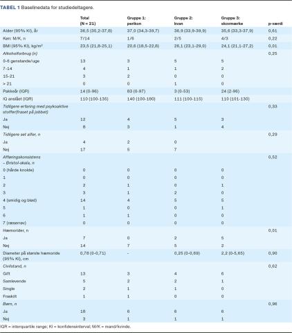 Deskriptiv statistik er primært blevet anvendt. Kontinuerte, normalfordelte data er beskrevet med 95% konfidens-intervaller (95% KI) og sammenlignet med variansanalyse (ANOVA), ikke-normalfordelte data er beskrevet med interkvartiler (IQR) og sammenlignet med Kruskal-Wallis-test, mens proportioner er sammenlignet med χ2 test. Ved parvise sammenligninger er den specifikke statistik udspecificeret i teksten eller tabeller. For gentagne, kontinuerte målinger er en speciel variansanalyse (mixed model) anvendt. P-værdier < 0,05 blev betragtet som signifikante. Al statistik er udført i STATA, version 13.1 (StataCorp, TX, USA).