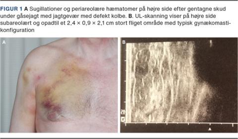 En rask 61-årig mand fik under jagt på julegås gentagne traumer af højre pektoralregion. Den normale rekyl fra et haglgevær bliver opfanget af skulder og øverste del af overarmen, hvor stødet fra geværkolben blev dæmpet af absorberende materiale og tøjpolstring. Aktuelt havde et brud på den bolt, som holder geværkolben i korrekt position, medført en medial vinkling af kolben, hvorved en skarp kant medførte gentagne rekylslag mod pektoralregionen. Defekten blev »i kampens hede« først erkendt af jægeren »efter adskillige skud, da det begyndte at gøre rigtig ondt«.