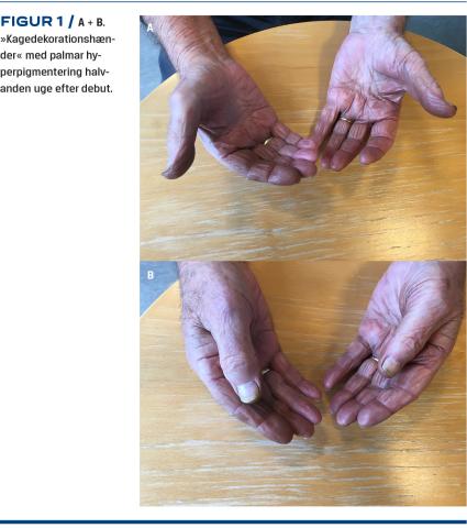 En 90-årig mand med hypertension og iskæmisk hjertesygdom mødte til ambulatoriekontrol på en øjenafdeling pga. aldersrelateret makuladegeneration. Han havde ingen kendte allergier og var alment i velbefindende, men ved undersøgelsen fandt man hyperpigmentering på begge hænders palmarside og misfarvning af neglelejet på begge tommelfingre (Figur 1). Han var i øvrigt asymptomatisk.