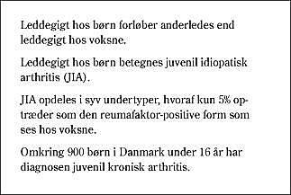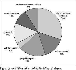 Juvenil idiopatisk arthritis (JIA) er en af de hyppigste kroniske lidelser med debut i barnealderen. Sygdommen rummer flere undertyper med forskellig genetisk disposition, klinik, behandling og prognose. Gennem tiderne har inddelingen af arthritis hos børn givet anledning til en del diskussion. Således har der været anvendt varierende klassifikation verden over, hvilket har gjort det vanskeligt at sammenligne behandlingsresultater. Den seneste klassifikation, der opdeler JIA i syv subtyper (Fig. 1 ), er udarbejdet af the Pediatric Standing Committee of the International League of Associations for Rheumatology (ILAR) i Durban i 1997 (1) og er nu ved at få fodfæste, men har også vist sine begrænsninger (2).