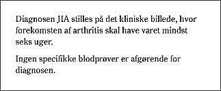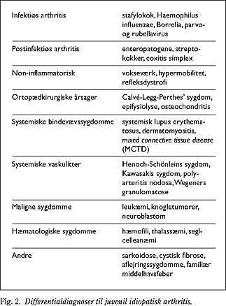 I definitionen på sygdommen JIA indgår, at man samtidig skal have udelukket andre mulige årsager til arthritis i barnealderen. Hos et barn med ledsmerter og/eller ledsvulst må man derfor altid ved grundig anamnese, objektiv undersøgelse og laboratorieanalyser sikre, at disse differentialdiagnoser nøje overvejes. En oversigt over differentialdiagnoser fremgår af Fig. 2 , men gennemgås ikke nøjere her.