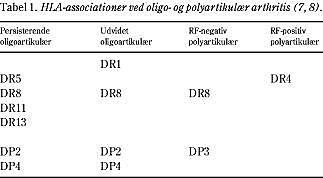 Vævstypestudier har vist forskellig genetisk disposition afhængig af subtype (6) og (Tabel 1 ). Oligoartikulær JIA er associeret med mindst tre forskellige områder af human leukocytantigen (HLA)-systemet: klasse I-antigenet A2, DR5 og DR8 i DR/DQ-regionen og DPB1*0201 i DP-regionen. DR8 viser stærkest association med en relativ risiko på 4-12 for den oligoartikulære type (25-50% har DR8). DR5 og DR11 har vist association til den antinukleær antistof (ANA)-positive oligoartikulære type, der udvikler uveitis. Blandt børn med den RF-positive form ses en tæt association til DR4 svarende til den voksne reumatoide arthritis. Ved enthesitisrelateret arthritis ses hyppig forekomst af HLA-B27 (op mod 50%).