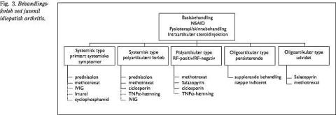 Behandlingsstrategien ved JIA bør tilrettelægges individuelt afhængig af subtype, sværhedsgrad og alder (Fig. 3 ). Behandlingen er en specialistopgave og vil ofte involvere en række fagspecialer, som foruden pædiatrisk reumatolog indbefatter fysioterapeut, ergoterapeut, øjenlæge, specialtandlæge og børneortopædkirurg. Gældende for alle subtyper behandles smerter og stivhed hyppigst med non-steroide antiinflammatoriske stoffer. Medikamentel behandling bør ikke stå alene, men suppleres med fysioterapi og skinnebehandling for at modvirke kontrakturer og bevare normal ledfunktion (Fig. 3).
