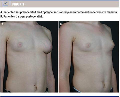 Tumoren blev fjernet via en inframammær incision. Tumoren strakte sig til bundfascien omgivet af en krans af kirtelvæv og med kirtelvæv udspændt kuppelformet ovenover. Efter excision havde brystet samme form som det modsidige (Figur 1). Drænet blev seponeret samme eftermiddag i forbindelse med udskrivelsen. Ved en histologisk undersøgelse blev diagnosen juvenilt FA bekræftet. Tumoren var lobuleret og velafgrænset med en størrelse på ca. 9 × 6 × 3 cm – altså et juvenilt gigant-FA.