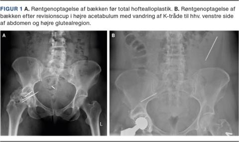 En 64-årig kvinde var som 36-årig involveret i en trafikulykke, hvor hun pådrog sig en højresidig traumatisk hofteluksation med fraktur af bagkanten af acetabulum (Figur 1). Skaden blev behandlet med åben reposition og fiksation af acetabulumfrakturen med tre K-tråde, som blev afklippet knoglenært og ladt in situ. Hun udviklede 19 år senere sekundær artrose og fik indsat en ucementeret total hoftealloplastik (THA) med skruefiksation af cuppen og afmejsling af periartikulære kalcifikationer. Peroperativt var der ikke synlig kontakt til K-trådene. Ved etårskontrollen var hun i velbefindende, og billeddiagnostisk var der uændret placering af THA’en og K-trådene. Syv år efter THA-operationen fik hun smerter i højre hofte. På mistanke om aseptisk løsning af en protesekomponent blev der foretaget knoglescintigrafi, som viste tegn på løsning af cuppen. Hun fik foretaget cementeret cuprevision, men havde postoperativt vedvarende smerter i hoften. Efter et længevarende fysioterapiforløb blev hun henvist til en ny vurdering hos en alloplastikkirurg.