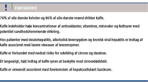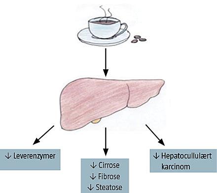 Et langvarigt, højt indtag af kaffe er i epidemiologiske studier påvist at være omvendt associeret med cirrosedødsfald, særligt blandt patienter med alkoholrelateret cirrose [14]. Kaffe er desuden associeret med nedsat risiko for at få cirrose. I et prospektivt studie med 22 års opfølgning fandt man således, at der var 80% nedsat risiko for alkoholrelateret cirrose hos patienter med et dagligt kaffeindtag på ≥ 4 kopper sammenlignet med hos ikkekaffedrikkere [15]. Kaffes omvendte association med cirroseudvikling er både afhængig af antallet af kopper pr. dag og af kaffeforbrugets samlede varighed [16, 17]. I et studie fandt man, at OR for cirrose