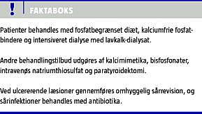 Enkelte patienter med ulcerationer på baggrund af kalcifylaksi har opnået overbevisende hurtig behandlingseffekt af bisfosfonatbehandling, som sænker kalcium-fosfat-produktet. Bisfosfonater bør dog anvendes med forsigtighed til patienter med GFR < 35 ml/min. Eftersom hudnekrose ved kalcifylaksi opstår sekundært til trombotisk okklusion, kan lavmolekylært heparin [11] og warfarin-behandling være relevant til at forhindre retrombose og tillade fortsat perfusion af huden. Resultaterne af antikoagulationsbehandling er varierende, og det er beskrevet at warfarin per se kan føre til kalcifylaksi, hvorfor forsigtighed bør udvises [7]. Også vævsplasminogen-aktivator og pentoxifyllin har været anvendt [31,32]. Endelig har hyperbar oxygenbehandling i trykkammer været afprøvet med nogen effekt [11, 33]. Analgetika og antibiotika anvendes på vid indikation.