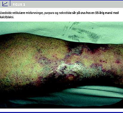 De klassiske kliniske tegn på kalcifylaksi er smertefulde panniculitis-lignende indurerede plaques og noduli i hud og subcutis, der ofte er ledsaget af rødviolette netagtige misfarvninger som ved livedo racemosa (Figur 1 ). Ofte kan man palpere subkutane noduli, der strækker sig flere centimeter fra de synlige hudforandringer. Det fuldt udviklede sygdomsbillede viser sig typisk i løbet af få dage eller uger, hvor tilstanden progredierer til smertefulde demarkerede sårdannelser, evt. med vesikler og hæmorragiske bullae over dybtliggende nekroser. Læsionerne kan fremkomme distalt, typisk på underekstremiteterne eller proksimalt på områder med rigeligt subkutant væv, dvs. abdomen, hofter, lår og overarme [2, 13, 14]. Usædvanlige lokalisationer er nakke, bryst og tunge [14, 15]. Distal affektion kan føre til nekrose af hænder, fingre, fødder, tæer eller penis [8, 9]. Usædvanlige ekstrakutane manifestationer med involvering af lever, pancreas, nyrer, binyrer, tarm, muskulatur, led, hjerte og lunger er beskrevet som led i systemisk kalcifylaksi [14, 16]. Der findes også beskrivelser af en protraheret form for kalcifylaksi, som udvikler sig mere benignt [17]. Hudforandringerne kan meget vel være en relativ sen manifestation af kalcifylaksi, idet autopsimateriale har vist forekomst af typiske kalkaflejringer uden sårdannelse i huden [18].