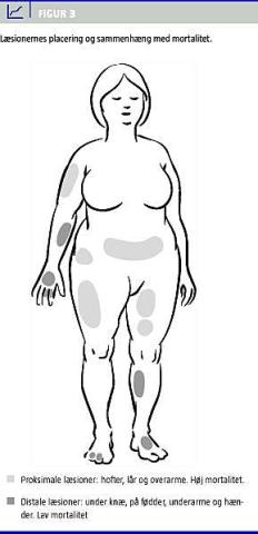Mortaliteten, der angives til 60-80%, er primært relateret til sepsis udgående fra sårinfektioner, dissemineret kalcifylaksi, multiorgansvigt eller komorbiditet med nyresvigt, diabetes, almen svækkelse og vægttab [9]. Hovedparten af studierne viser, at proksimale læsioner har en væsentlig dårligere prognose sammenholdt med distale læsioner [12, 13]. Der findes ingen danske opgørelser over forekomsten af kalcifylaksi, men tilstanden er formentlig underdiagnostiseret.