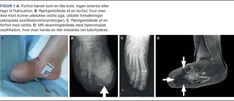 Halvandet år efter ophelingen var forfoden hævet som en lille bold. Trods dette kunne patienten gå på foden. Han anvendte en terapisandal, som var det eneste fodtøj, han kunne bære pga. fodens facon og størrelse (Figur 1A). Der var ingen smerter eller tegn til fluktuation. På et røntgenbillede kunne man ikke klart udelukke ostitis pga. de udtalte forkalkninger (Figur 1B). MR-skanning viste ingen tegn til osteomyelitis, dog viste den heterotopisk ossifikation, hvilket tydede på svær sekundær eller tertiær hyperparatyroidisme (Figur 1D).