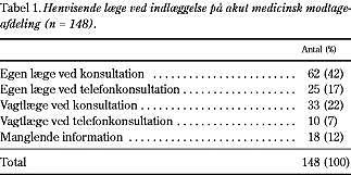 Materiale og metoder: Alle akutte indlæggelser på medicinsk afdeling F på Amtssygehuset i Gentofte blev opgjort prospektivt i to seksdagesperioder. Et struktureret spørgeskema blev udfyldt af afdelingens læger ved indlæggelsen og ved gennemgangen af patienten. En tredjedel af indlæggelserne blev efterfølgende vurderet af afdelingens praksiskonsulent på baggrund af en anonymiseret kopi af indlæggelsesjournalen.