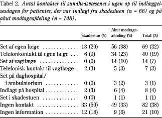 Patienternes kontakt til sundhedsvæsenet i ugen op til indlæggelsen fremgår af Tabel 2 , idet den aktuelle kontakt, som førte til indlæggelsen, ikke er inkluderet i tabellen. I ugen forud for indlæggelsen havde en tredjedel af patienterne været set af egen læge mindst en gang, og 7% af patienterne havde haft besøg af en vagtlæge. Kontakten til sundhedsvæsenet ugen før indlæggelsen var generelt mindre hos patienter, der var indlagt fra skadestuen. Indlæggelsesdiagnoserne for de patienter, der blev indlagt fra skadestuen, og som havde haft kontakt til egen læge, adskilte sig ikke væsentligt fra diagnosemønstret ved indlæggelse direkte fra primærsektoren.