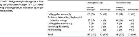 Undersøgelsens anden del indeholdt en vurdering af indlæggelsernes nødvendighed. Den »gennemgående« læge vurderede 209, og praksiskonsulenten 72 indlæggelser (Tabel 3 ). Næsten alle indlæggelser fra skadestuen blev vurderet som nødvendige (gennemgående læge 87%) (praksiskonsulent 92%), mens indlæggelserne fra primærsektoren blev vurderet som nødvendige hos færre (gennemgående læge 71%) (praksiskonsulent 67%). Andelen af indlæggelser, hvor subakut indlæggelse på et daghospital eller hurtig ambulant udredning var et realistisk alternativ, var procentvist størst for patienter, der var indlagt af egen læge. En direkte sammenligning af vurderingerne fra praksiskonsulenten og den gennemgående læge viser overensstemmelse hos 57 ud af 72 patienter.