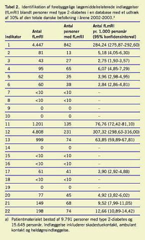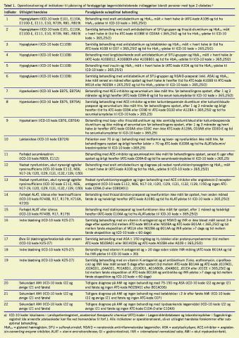 I den danske medicinsk teknologivurdering (MTV)-rapport fra 2003 om type 2-diabetes blev det fastslået, at »type 2-diabetes bliver en af de største sundhedsmæssige udfordringer for det danske sundhedsvæsen i de kommende år« [1]. Kontrol med hyperglykæmi, hypertension og dyslipidemi kræver intensiv lægemiddelbehandling og -monitorering, men behandling med hjerte-kar-midler og antidiabetika øger sam-tidig risikoen for utilsigtede lægemiddelhændelser [2, 3]. Omkring halvdelen af alle utilsigtede lægemiddelhændelser kan ifølge litteraturstudier forebygges [4-6]. Da mange af disse hændelser kræver hospitalsindlæggelse, har de ofte store konsekvenser for både patienten og sundhedsvæsenets økonomi. Baseret på et studie af Hallas et al kan prævalensen af forebyggelige lægemiddelrelaterede indlæggelser (fLmRI) på medicinske afdelinger bestemmes til 3,8% [7], hvilket stemmer overens med prævalensen på 4,3%, der er rapporteret i en metaanalyse [8]. Omfanget af fLmRI er et mål for behandlingskvalitet, men det er ukendt for type 2-diabetes. Derfor blev et sæt kvalitetsindikatorer udviklet, som modsat diabetesindikatorerne, der er udviklet til Det Nationale Indikatorprojekt [9], udelukkende bruges til opsporing af fLmRI. De måler derfor på manglende kvalitet modsat opfyldt kvalitet og måler desuden på en kombination af behandlingsproces og -udfald og ikke kun behandlingsproces. Det ville være ønskeligt at anvende nationale sundhedsdata som datagrundlag for indikatorerne. Formålet med dette studie var derfor at vurdere, i hvilken udtrækning danske sundhedsregistre er egnede som datagrundlag for de udviklede indikatorer. Grundlaget var en kvalitativ vurdering af de operationaliserede indikatorers sensitivitet og specificitet samt identifikation af indikatorudfald.