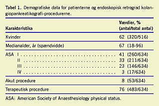 Resultater: Der blev inkluderet 634 procedurer på 516 patienter. Medianalderen var 67 år, og 74% af patienterne blev klassificeret med risikoscore American Society of Anaesthesiology physical status (ASA) 1 eller ASA 2. Kun 5% af procedurerne måtte opgives. Procedurerne inkluderede terapi hos 76% og kun diagnostik hos 19%. Den specifikke ERCP-relaterede morbiditetsrate var 6,9% og den specifikke ERCP-relaterede mortalitetsrate var kun 0,3%. Fraset pre-cut- teknikken kunne der ikke påvises nogen risikofaktorer for udvikling af komplikationer i forbindelse med ERCP-proceduren.