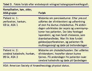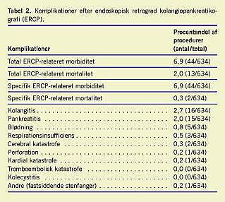 Detaljer om komplikationerne er anført i Tabel 2. Det var kun et lille antal af komplikationerne, der opstod under eller umiddelbart efter selve ERCP-proceduren (syv ud af 44, 16%). Den totale og den specifikke ERCP-relaterede komplikationsrate var begge 6,9%, mens den totale ERCP-relaterede mortalitet var 2%. Ni af de 11 dødsfald indtraf hos patienter med svært fremskreden pancreascancer, og de to sidste dødsfald skyldtes duodenal perforation og cerebral katastrofe. Derfor er den specifikke ERCP-relaterede mortalitet kun 0,3%. I et andet nyligt publiceret dansk studie med lignende patientmateriale og studiekriterier [16] fandtes der højere total 30-dages ERCP-relateret morbiditet (15,8%) og specifik ERCP-relateret mortalitet (1%).
