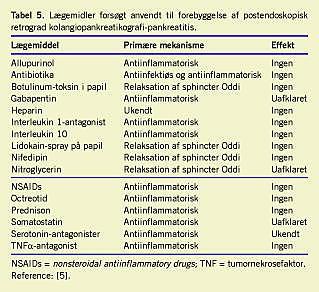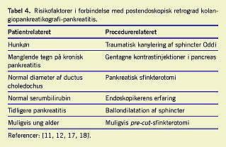 Klinisk betydende akut pankreatitis er en hyppig (1-13%) og frygtet komplikation ti forbindelse med ERCP. I vort studie udvikledes der kun pankreatitis efter ERCP hos 2%, og hos ingen førte det til dødelig udgang. Alle tilfælde var lette og krævede ikke yderligere intervention. Patogenesen for udvikling af post ERCP pankreatitis er ikke klarlagt, men skyldes formentlig en præmatur intracellulær aktivering af proteolytiske enzymer. Talrige risikofaktorer for post ERCP-pankreatitis er påvist (Tabel 4 ) [11]. Forebyggelse af beskadigelse af pancreas i forbindelse med ERCP må derfor indeholde både patientrelaterede og procedurerelaterede tiltag. I Tabel 5 er de medicinske tiltag, som er forsøgt, og effekten af dem angivet. Mange af disse tiltag baseres på antagelsen om, at patienterne befinder sig i en akut eller kronisk tilstand med lokal og/eller systemisk inflammation med deraf følgende øget risiko for specielt post ERCP-pankreatitis [11]. Af procedurerelaterede tiltag synes kun anlæggelse af kort stent i ductus pancreaticus at kunne forebygge post ERCP-pankreatitis hos de patienter, der sfinkterotomeres for sphincter Oddi-dysfunktion. Herimod skal opvejres den risiko, der tages, såfremt det ikke lykkes at få anlagt stenten.