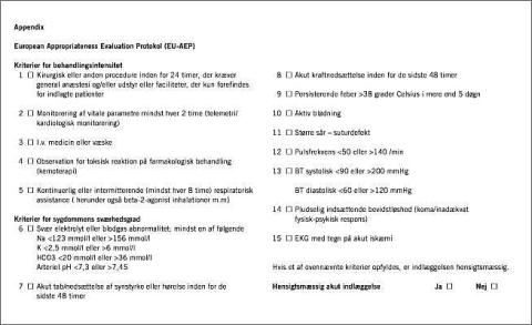 I European Appropriateness Evaluation Protocol er der opstilet en række objektive kriterier for, om en patient er indlæggelseskrævende [12] (se Appendix). Det er i flere undersøgelser konkluderet, at protokollen er det bedste redskab til at bedømme hensigtsmæssigheden af indlæggelser [13]. Protokollen er endnu ikke evalueret her i landet.