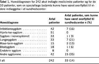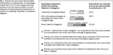 Materiale og metoder: En speciallæge og en sygeplejerske bedømte, om 242 konsekutivt indlagte patienter kunne tænkes overflyttet til et sundhedscenter, efter at patienten var blevet undersøgt ved indlæggelsen, efter udløb af første indlæggelsesdøgn og på et senere tidspunkt af indlæggelsen. Hensigtsmæssigheden af indlæggelsen blev vurderet i forhold til European Appropriateness Evaluation Protocol.