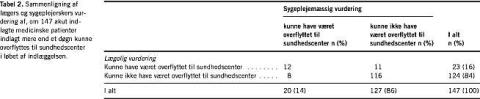 I alt 147 (61%) af de 242 patienter forblev indlagt mere end et døgn. Otte (5%) af de 147 patienter vurderedes af sygeplejersken at kunne have været overflyttet til et sundhedscenter efter et døgns indlæggelse, 20 patienter (14%) vurderedes at kunne have været overflyttet senere i løbet af indlæggelsen. I Tabel 2 er den lægelige og sygeplejemæssige vurdering sammenlignet hos de patienter, som forblev indlagt mere end et døgn.