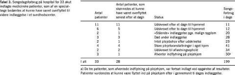 Resultater: I alt 33 patienter (14%) fandtes i løbet af indlæggelsen at kunne være overflyttet til et sundhedscenter, som samtidig vurderedes at kunne aflaste hospitalet for otte senge. Indlæggelsen bedømtes som uhensigtsmæssig hos 28 patienter (11%).