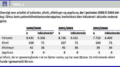 Undersøgelsen er baseret på data fra Århus Amts patienttilfredshedsundersøgelser fra 1999 til 2004. Udvikling og validering af spørgeskemaet er beskrevet i en anden artikel [10]. Sengeafsnit, der i hver runde havde opnået mere end 20 svar, blev inkluderet. To afdelinger med i alt 15 afsnit blev kontaktet, fordi der var tvivl om hvilke afsnit, der med rimelighed kunne sammenlignes over tid. Det betød, at fire afsnit måtte ekskluderes fra analysen