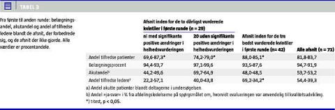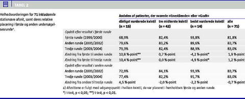 Tilsvarende var belægningsprocenten i anden runde højere (99,6%) for de 20 afsnit i de dårligst vurderede kvintiler, der ikke opnåede en forbedring i tilfredsheden, end den var for de afsnit, der faldt indenfor de tre bedst vurderede kvintiler (87,6%). Forskellen var signifikant (p = 0,01; t-test). De ni afsnit fra de to dårligst vurdere kvintiler med signifikante forbedringer havde en belægningsprocent, der lå herimellem (93,7). Denne belægningsprocent adskiller sig ikke signifikant fra hverken de bedst vurderede afsnits, eller fra de 20 dårligst vurderede afsnit uden fremgang (Tabel 3). Patientpopulationens sammensætning har været konstant i perioden for dataindsamlingen.