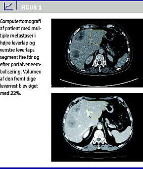 Leverresektion anses indtil videre for at være den mest effektive behandling af kolorektale levermetastaser. En forudsætning for langtidsoverlevelse er, at der opnås en R0-resektion (makro- og mikroradikal). Metastaser fra kolorektal cancer er langt den hyppigste indikation for leverkirurgi [1]. Desværre er kun 10-15% af patienterne tilgængelige for leverkirurgi på diagnosetidspunktet. I de seneste årtier er der sket et paradigmeskift i opfattelsen af, hvornår levermetastaser er resektable. Patienter med flere end tre metastaser, bilobære metastaser, lymfeknudemetastaser i leverhilus, lungemetastaser eller en mulig kirurgisk margin på < 1 cm blev ofte betragtet som ikkeresektable. Nu fokuseres der ikke længere på, hvad der kan fjernes, men hvad der er tilbage efter resektionen. Kan der opnås en R0-resektion (for hepatisk og ekstrahepatisk sygdom) med samtidig bevarelse af sufficient volumen af den fremtidige leverrest (~ 20-30% af det totale levervolumen), betragtes patienten som resektabel. Det er derfor muligt at øge resektabiliteten hos primært ikkeresektable patienter, hvis metastaserne kan gøres mindre, eller volumen af den fremtidige leverrest kan øges. Med moderne kombinationskemoterapi synes det muligt at reducere metastasernes størrelse, så op mod 35% af de primært ikkeresektable patienter bliver tilgængelige for leverresektion uden øget operativ risiko og med en treårsoverlevelse på 73% [2]. Volumen af den fremtidige leverrest kan øges ved portalveneembolisering (PVE). Oftest emboliseres den højre portalgren +/− segmentfire-grenene, for at få segment to og tre i venstre leverlap til at hypertrofiere (Figur 1 ). PVE øger volumen af den fremtidige leverrest med ca. 9-15%, hvilket muliggør ekstensive resektioner. Patienter med multiple bilobære metastaser har mulighed for kurativ resektion ved såkaldt two-stage -resektion. Ved den første operation foretages leverbesparende lokal resektion eller radiofrekvensablation (RFA) af metastaserne i den fremtidige leverrest (typisk segment to og tre), der suppleres enten med peroperativ ligering af den højre portalvene eller postoperativ transhepatisk PVE. Ca. seks uger efter foretages fornyet computertomografi eller magnetisk resonans-skanning for at vurdere resekatabiliteten. Er R0-resektion mulig med sufficient volumen af den fremtidige leverrest, fortsættes med den anden operation. Her fjernes de resterende metastaser med en højresidig eller udvidet højresidig hemihepatektomi. I perioden mellem de to operationer kan der gives kemoterapi, uden at det påvirker hypertrofien af den fremtidige leverrest. Two-stage -resektion kan opnås hos ca. 75% af patienterne, uden perioperativ mortalitet og med en femårsoverlevelse på 50% [3].
