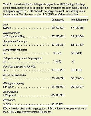 Der blev fra de ti lægepraksis udsendt i alt 2.299 spørgeskemaer. Der kom besvarelser fra 259 rygere (11,3% af den samlede patientgruppe), heraf 146 kvinder og 113 mænd. Blandt respondenterne mødte 185 (71,4%) op til introduktionskonsultationen (110 kvinder og 75 mænd). Tabel 1 viser køn, rygeanamnese, symptomer fra lunger, symptomer fra hjerte, indlæggelse grundet lungesygdom, familiær disposition til KOL, påbegyndt rygning, ønske om rygeophør, samt lungefunktion og kulmonooxid i udåndingsluften for de rygere, der mødte op til konsultation. Blandt de rygere, som mødte i konsultationen, var relativt flere med forskellige sygdomssymptomer og motivation for rygeophør end blandt dem, som ikke kom. Egen læge fandt, at 12 patienter opfyldte kriterierne for KOL og inviterede dem til kontrolforløb. Projektets dataark viste, at yderligere 13 patienter havde FEV1/FVC-værdier under grænseværdien. Tre af disse fik normaliseret værdierne ved reversibilitetstest, mens de resterende ti ikke havde fået udført denne test og ikke havde fået tilbud om kontrolforløb. Fem af de 12 (41,7%) patienter, som fik tilbud om kontrolforløb, mødte op til den første opfølgende konsultation, fire (33.3%) til anden opfølgende konsultation, mens kun en mødte op til tredje og fjerde opfølgende konsultation. Ingen af patienterne, der indgik i kontrolforløb, ændrede rygevaner (rygeophør eller nedsættelse af tobaksforbruget).