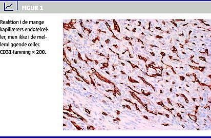 Ved yderligere undersøgelser sås der ingen tegn til metastaser, og den patologiske undersøgelse af præparatet viste et kaposiformt hæmangioendoteliom uden spredning til lymfeknuderne (Figur 1 ). Biokemien gav ikke holdepunkter for associeret Kasabach-Merritts syndrom.