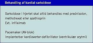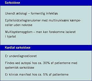 Summary Cardiac sarcoidosis Ugeskr Læger 2006;168(44):3801-3806 The paper gives a review of the epidemiology, clinical manifestations, diagnosis, treatment and prognosis of cardiac sarcoidosis. Approximately 30% of patients with systemic sarcoidosis have granulomas in the myocardium, and 5% have clinical signs of cardiac affection. Cardiac manifestations comprise pericarditis, heart block, ventricular arrhythmias, valvular disease, ventricular aneurism, congestive heart failure and sudden cardiac death. Most frequent causes of death are sudden death and heart failure. Adequate treatment improves the prognosis of the disease.