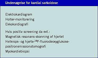 Den sande incidens af kardial sarkoidose både som led i systemisk sarkoidose og som monoorgansygdom kendes ikke, men pga. den vanskelige diagnostik og den lave autopsifrekvens er sygdommen utvivlsomt underdiagnosticeret. Patienter med ekstrakardial sarkoidose bør screenes for kardial affektion - initialt med anamnese, elektrokardiogram (EKG), Holter-monitorering og ekkokardiografi. Afhængig af resultatet af disse undersøgelser kan man gå videre med MR-skanning, PET og endomyokardial biopsi.