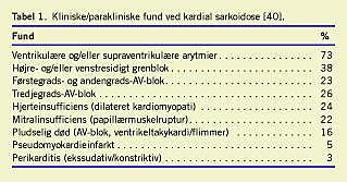 De fleste tilfælde af kardial sarkoidose forekommer hos patienter med kendt systemisk sarkoidose, oftest pulmonal sarkoidose, der ses hos mere end 90% [1]. Der findes imidlertid også isoleret kardial sarkoidose, dvs. uden klinisk affektion af ekstrakardiale organer [5-7]. De kardiale manifestationer spænder bredt og omfatter perikarditis, ledningsforstyrrelser, arytmier, klapinsufficiens, ventrikelaneurismer, hjerteinsufficiens og pludselig kardial død (Tabel 1 ). Klinisk kan kardial sarkoidose således ligne en række andre hjertesygdomme, bl.a. af iskæmisk genese.