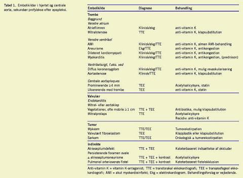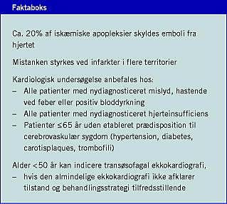 Omkring 20% af iskæmiske apopleksier anses for at være udløst af emboli fra intrakardiale tromber, vegetationer eller tumorer. Disse kan erkendes visuelt ved transtorakal ekkokardiografi (TTE) eller transøsofageal ekkokardiografi (TEE) (Tabel 1 ). Ekkokardiografi kan derfor forekomme at være rationel ved apopleksi. Prioritering af den kardiologiske kapacitet muliggør ikke undersøgelse af alle, og nyttevirkningen (andelen af resulterende evidensbaserede behandlinger) retfærdiggør næppe heller et sådant tilbud. F.eks. afsløres embolikilde med ny behandlingskonsekvens hos færre end 5% efter TTE og hos færre end 4% efter supplerende TEE. Tallene hidrører fra en metaanalyse gennemført af en arbejdsgruppe af nordiske kardiologer og neurologer. På baggrund af en omfattende litteraturgennemgang rekommanderedes en selektiv undersøgelsesstrategi [1], der med få ændringer inkorporeredes i den landsdækkende anbefaling for undersøgelse og behandling af apopleksipatienter [2]. I denne statusartikel resumeres baggrund og indhold suppleret med relevante resultater, der siden er fremkommet eller afventes.